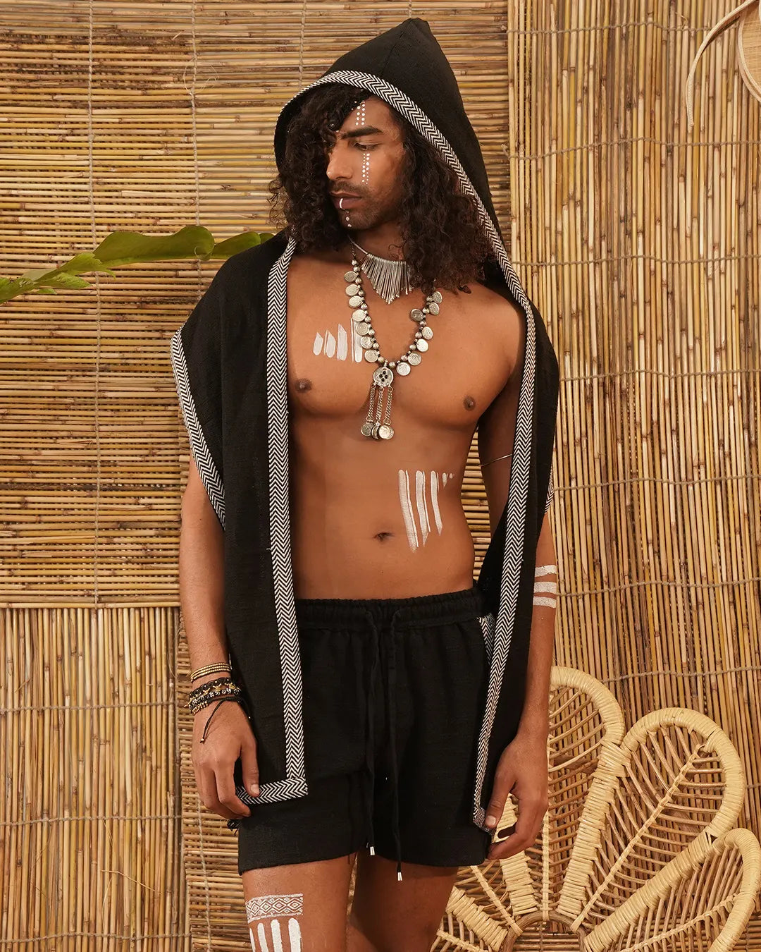 Rooted in ancient tribal aesthetics and built for modern free spirits, this hooded head scarf is crafted from breathable jute–cotton fabric that feels light, earthy, and alive on the skin. The integrated hood adds a ritualistic silhouette, while the white tribal print brings ancestral symbolism into everyday wear.