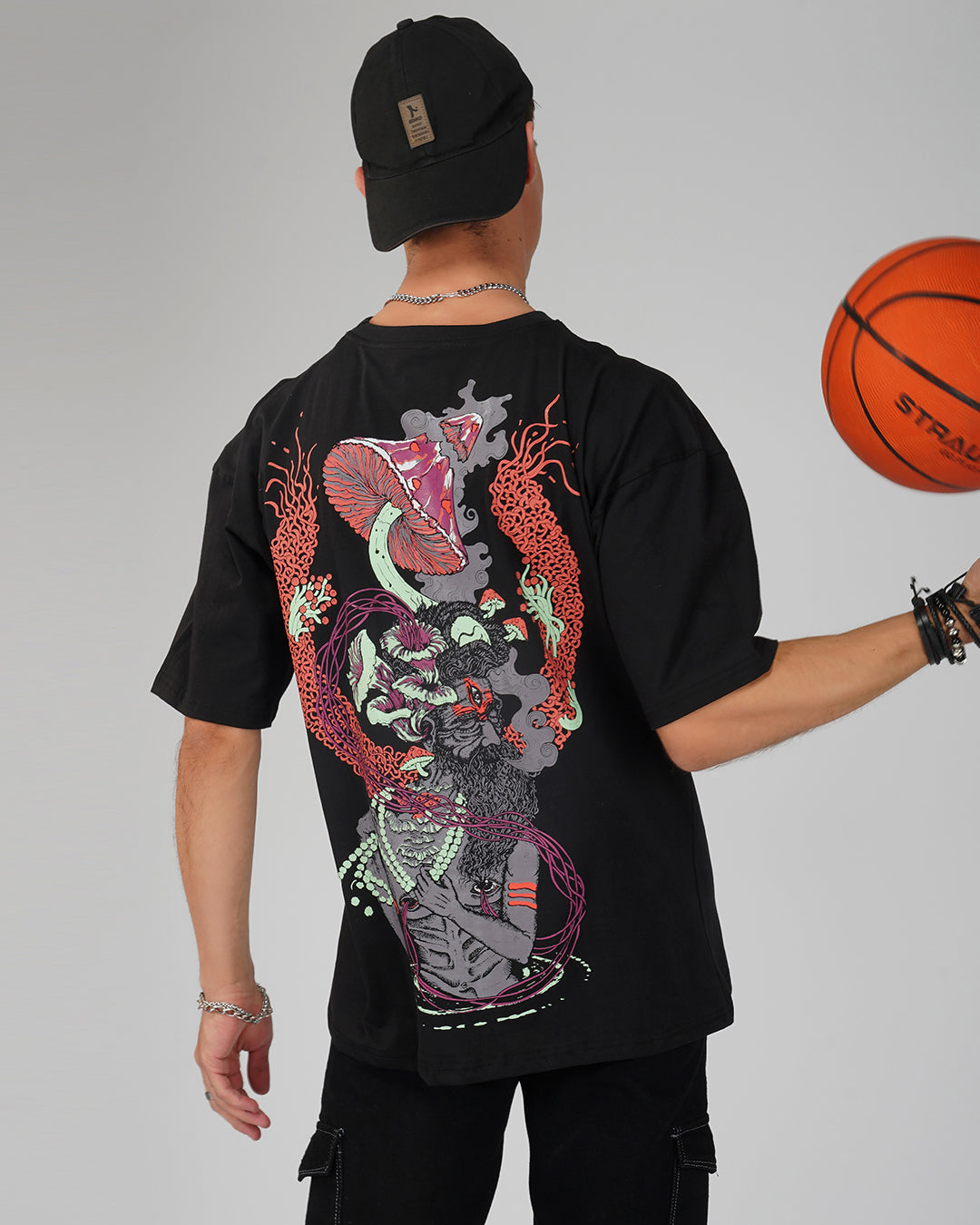 A person viewed from the back wearing a black oversized t-shirt with a psychedelic print.
