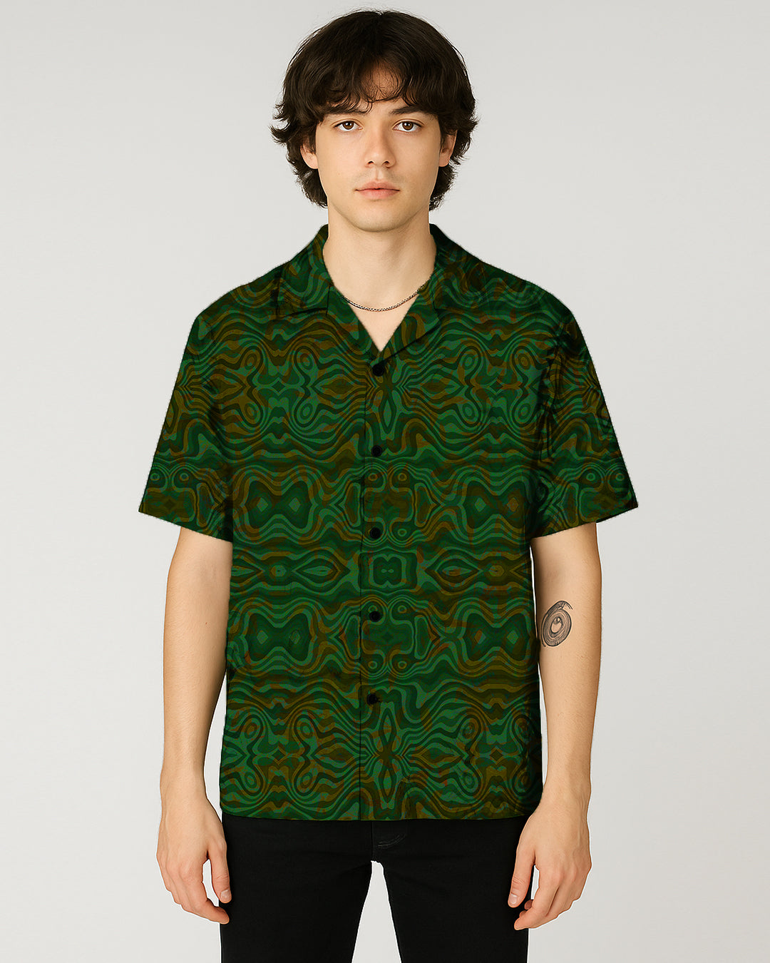Each shirt is individually cut from our custom-printed fabric, so the artwork placement varies, making every item one-of-a-kind. Finished with a camp collar, relaxed fit, and button-up front, it delivers an easy, versatile look for everyday wear.