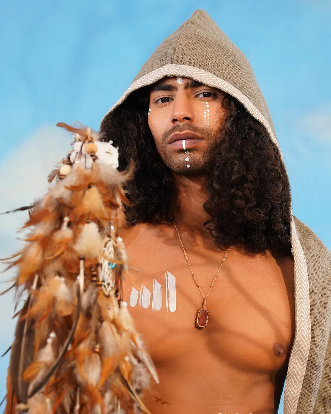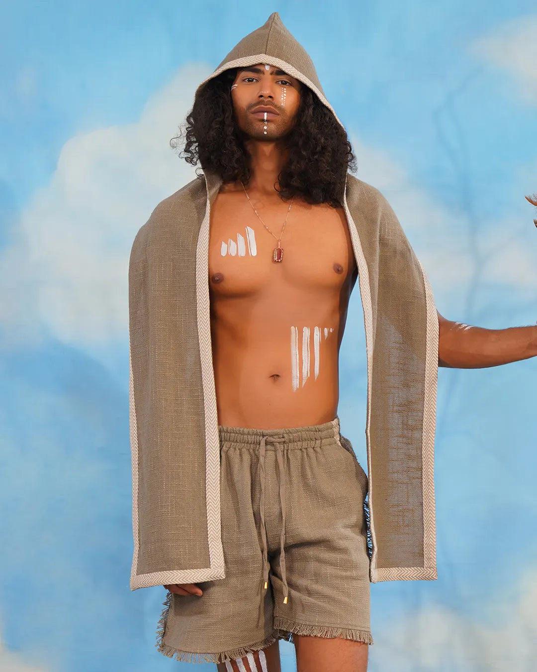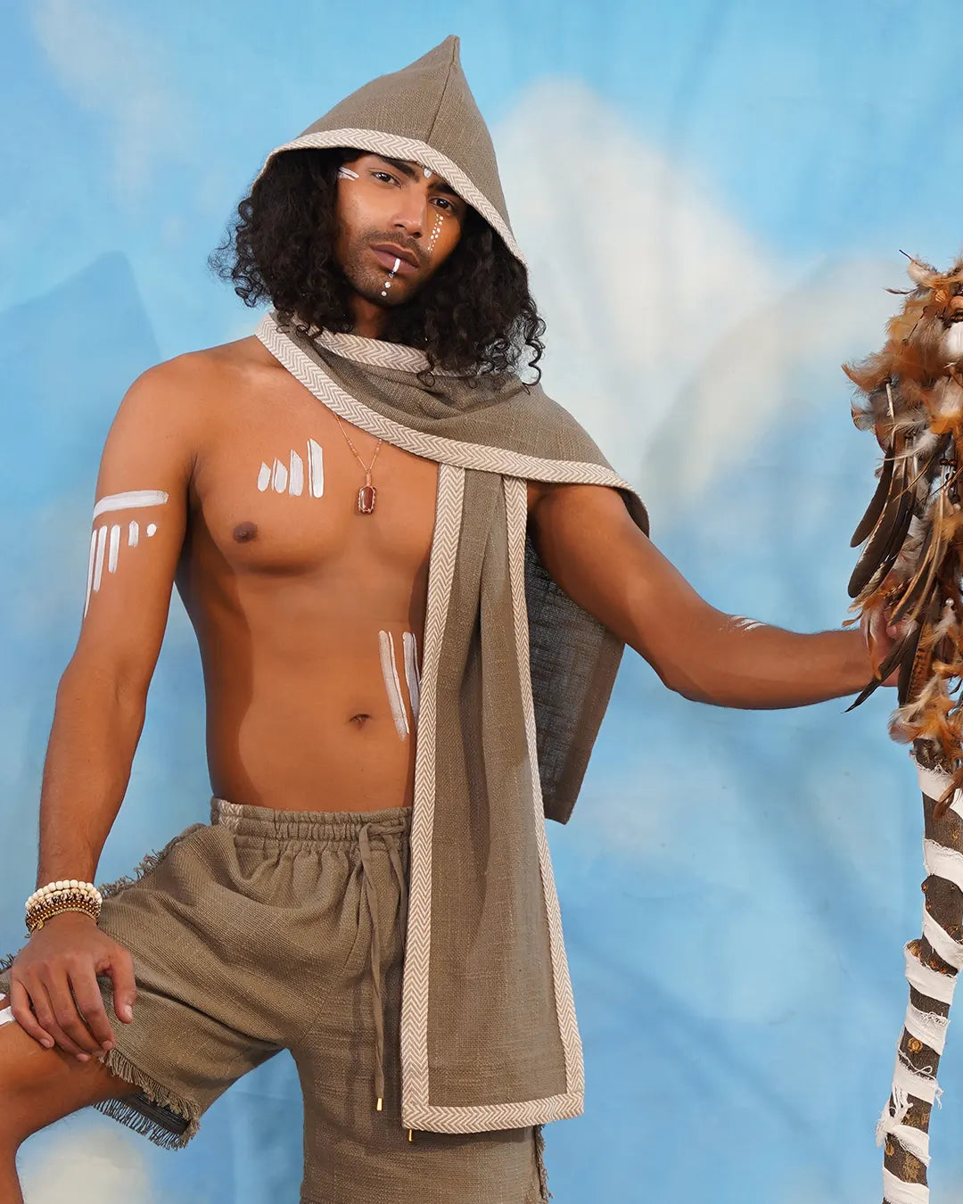 Rooted in ancient tribal aesthetics and built for modern free spirits, this hooded head scarf is crafted from breathable jute–cotton fabric that feels light, earthy, and alive on the skin. The integrated hood adds a ritualistic silhouette, while the white tribal line print brings ancestral symbolism into everyday wear.