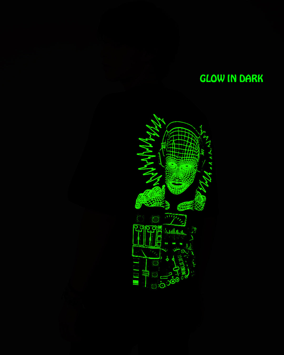 A person wearing an oversized black t-shirt with a geometric pattern that is UV light reactive and glow in the dark.