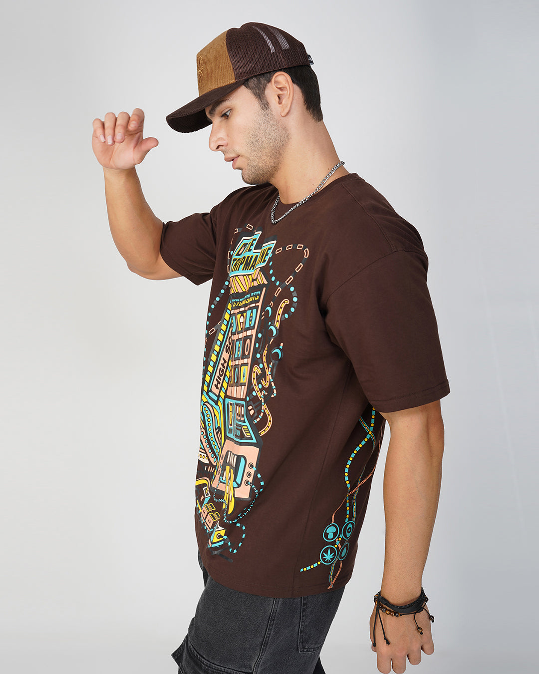 This oversized cotton t-shirt is made with 100% premium quality fabric and features a round neck, half sleeves, and a long fit. The hand-made silk screen print on the base color Temptress is the main trend, creating a UV light reactive effect. This t-shirt is perfect for both casual and party occasions and can be easily washed in a machine with cold water. For the perfect fit, refer to our size chart.